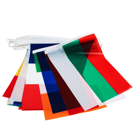 Imprimé sur un plastique transparent, la guirlande est composée de 28 fanions des pays appartenant à l'Union Européenne avec en plus le drapeau de l'UE. Les fanions mesurent 30 x 20 cm et la guirlande 10 m. Cette guirlande économique est vendue par lot de 20 exemplaires. Un support de communication officielle qui habillera toutes vos décorations en quelques secondes.