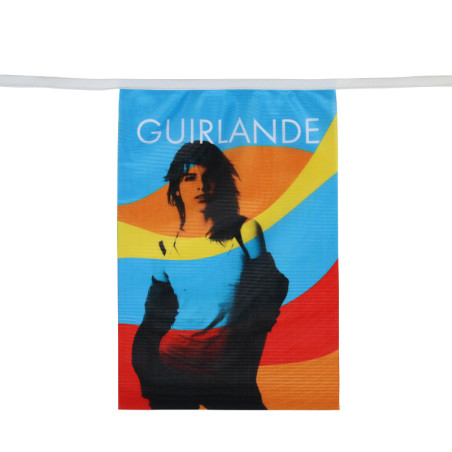 Les guirlandes publicitaires se composent de fanions en textile personnalisables. Réalisées grâce à une très grande qualité d'impression au sein de nos ateliers, les guirlandes décorent vos événements indoor et outdoor.