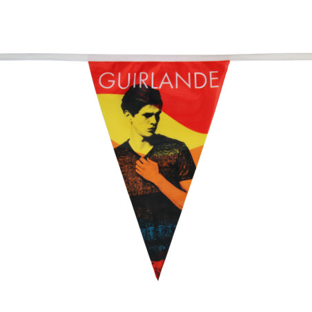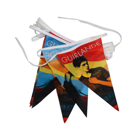 Les guirlandes publicitaires se composent de fanions triangles personnalisables imprimés sur un textile polyester résistant. La guirlande fanion tissu est spécialement conçue pour se fixer facilement avec sa longueur de 10 m. La guirlande extérieure s'utilise aussi en intérieur, pour dynamiser vos événements foires, salons, showroom et opérations commerciales. La guirlande tissu est assemblée avec 10 ou 20 fanions en fonction de vos besoins.
