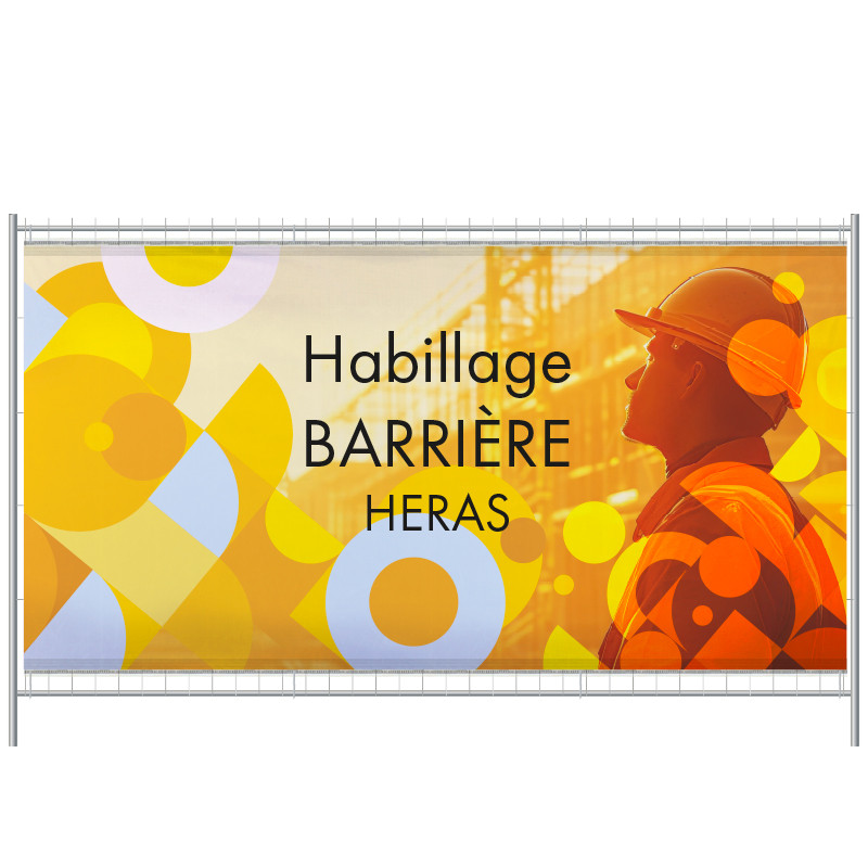 | DIMENSION | Personnalisé (H x L) Visuel : 95 x 340 cm (H x L) pour Barrière Heras 120 x 350 cm (H x L) Visuel : 175 x 340 cm (H x L) pour Barrière Heras : 200 x 350 cm (H x L) |