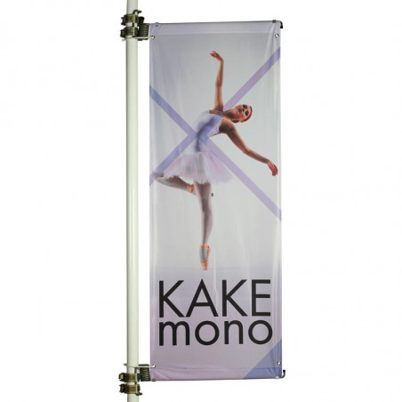 Composé d'un kakemono publicitaire imprimé sur textile et d'un jeu de potences à ressorts robustes, le kakemono personnalisé se fixe sur les poteaux fixés au sol comme les lampadaires ou candélabres. Son système de montage double assure une tension parfaite du kakemono imprimé pour garantir une visibilité parfaite. Le support kakemono tissu assure une efficacité de communication extérieure incomparable. Disponible dans plusieurs dimensions standards, vous disposez également d'un format sur mesure. Les dimensions indiquées comprennent les fourreaux haut et bas confectionnés sur le visuel textile.