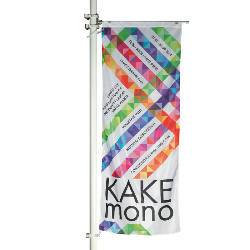 - Le kakémono personnalisé se glisse dans la potence avec un fourreau en partie haute. La partie basse du visuel est fixée au lampadaire grâce à un oeillet, cela va donc permettre de laisser le tissu publicitaire flotté au vent le long du lampadaire.