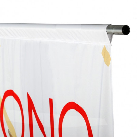 Le kakémono publicitaire est constitué d'un visuel textile ou d'une bache pvc imprimés qui se glisse autour d'une barre de suspension en aluminium grâce à un fourreau.