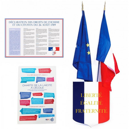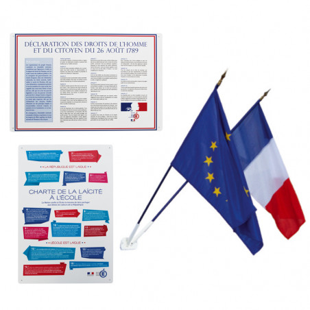 La société MACAP vous propose également l’achat à l’unité de chaque produit contenu dans le kit Loi Peillon : la charte de la laïcité, la Déclaration des droits de l’homme et du citoyen, les drapeaux spécifiques à la Loi Peillon : drapeau de France et drapeau d’Europe, et l’écusson porte-drapeau.