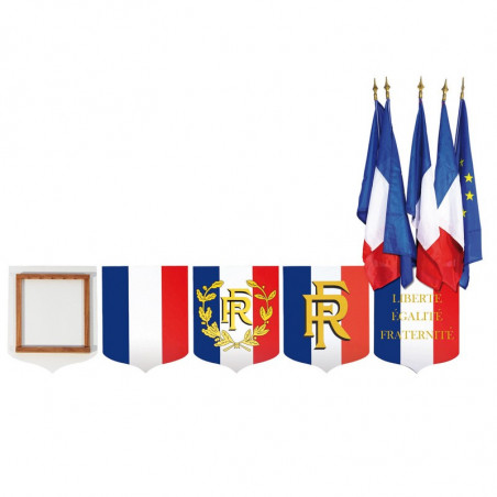 Ce kit complet est composé d'un écusson porte-drapeaux et d'un choix de 3 à 5 drapeaux français et Union Européenne (60 x 90 cm et ø hampe 16 mm). Le blason tricolore est fabriqué en PVC rigide avec une ossature en bois au verso; il mesure 50x40 cm et pèse 1,2 kg. Un large choix d'écussons est proposé : simple, avec RF, avec RF et palmes, Union Européenne (UE). Le système de fixation et la visserie sont livrés avec le blason, il est bien évidement à adapter en fonction de son support et de son implantation.