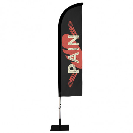 . Un mât d’une hauteur de 2.80 m, une voile personnalisée 220X50 cm dotée d’un fourreau noir, un pied carré robuste en acier noir 40x40 cm (6.5 kg)