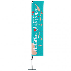 . Un mât d’une hauteur de 2.30 m, une voile personnalisée 160x50 cm dotée d’un fourreau noir, un pied carré robuste en acier noir 40x40 cm (6.5 kg)