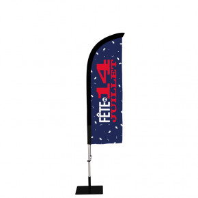 . Un mât d’une hauteur de 2.30 m, une voile personnalisée 160x50 cm dotée d’un fourreau noir, un pied carré robuste en acier noir 40x40 cm (6.5 kg)