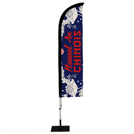. Un mât d’une hauteur de 2.80 m, une voile personnalisée 220X50 cm dotée d’un fourreau noir, un pied carré robuste en acier noir 40x40 cm (6.5 kg)