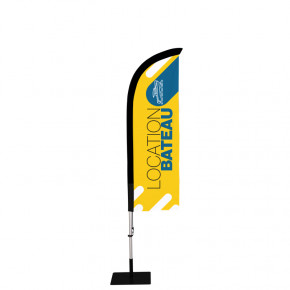 . Un mât d’une hauteur de 2.80 m, une voile personnalisée 220X50 cm dotée d’un fourreau noir, un pied carré robuste en acier noir 40x40 cm (6.5 kg)